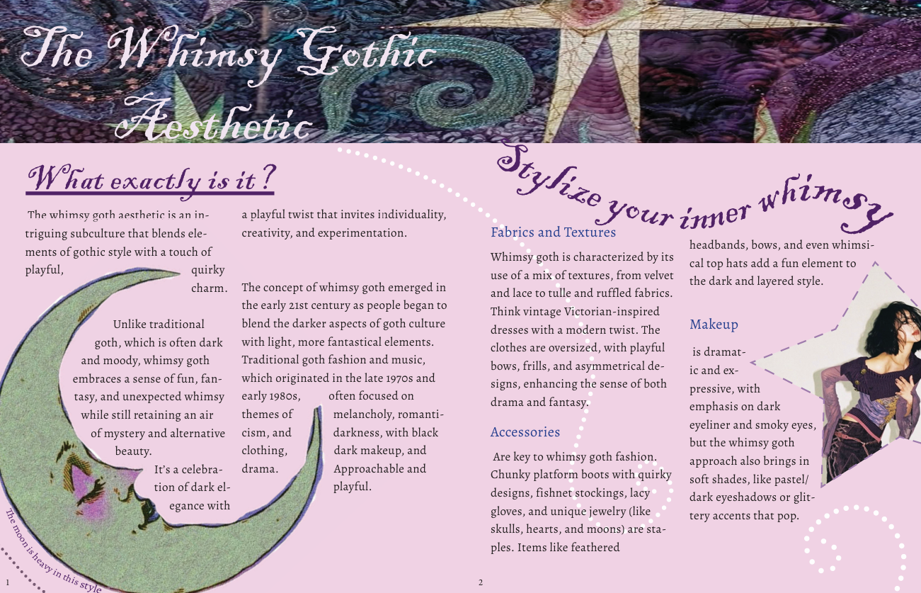 A magazine spread for the whimsical goth aesthetic. Playful but quirky, moody but fun.