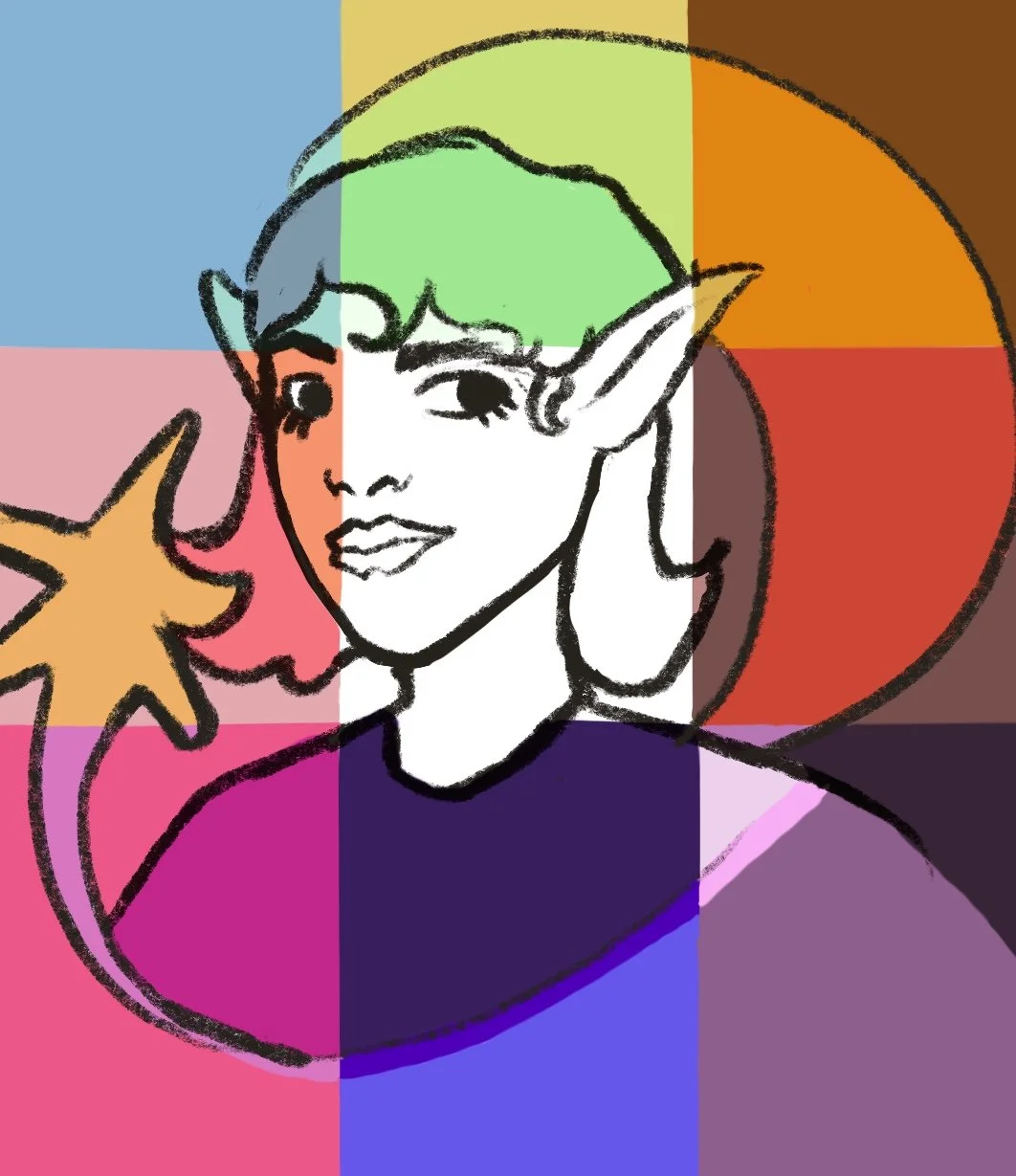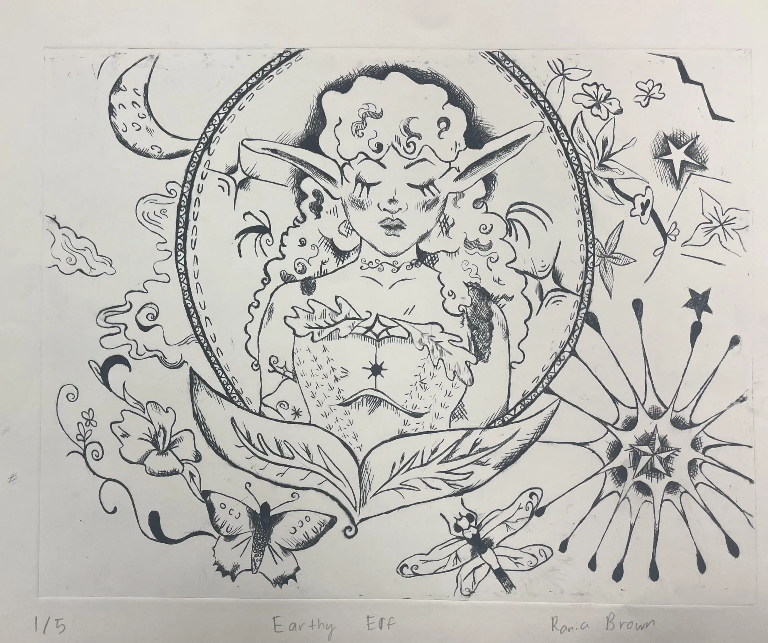 Earthy Elf is a printmaking edition featuring mystical women and inspired by graphic designer Mucha Alphonse. It features curvilinear lines and nature concepts mixed with whimsical elements.