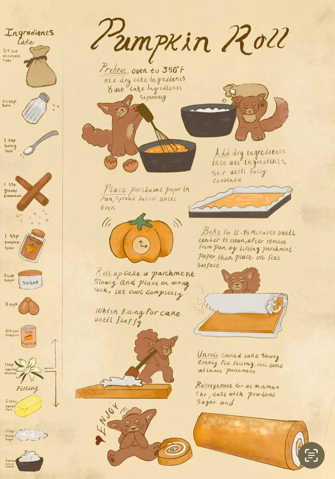 A cute and playful spin of a recipe of a fall. Including an animal correlating to fall a fox, I wanted to make it seem nostalgic and comforting. Created using procreate.